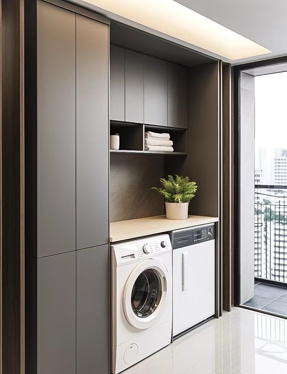 Install floating shelves above the washer/dryer for open storage, paired with concealed hooks for hanging laundry bags or ironing boards. Use matte-finish cabinets in soft pastels to add a modern touch.