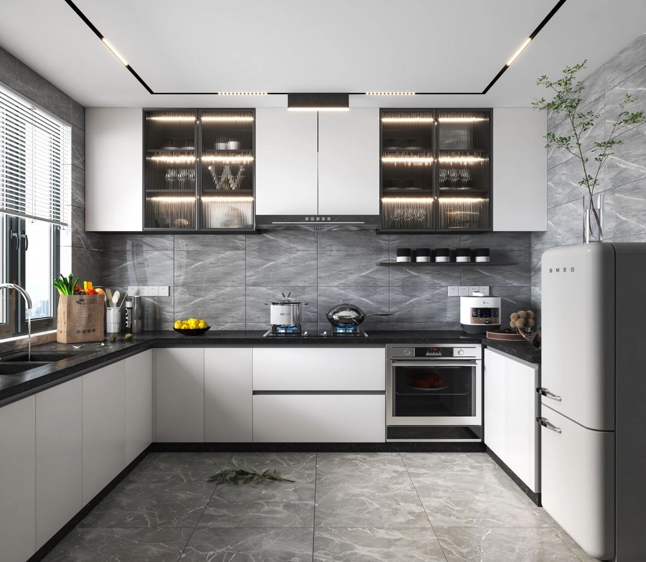 Discover a modern L-shaped kitchen cabinet featuring wood-grain finishes, marble backsplash, LED lighting, and full customization. Designed and manufactured by Murano for stylish and functional homes.